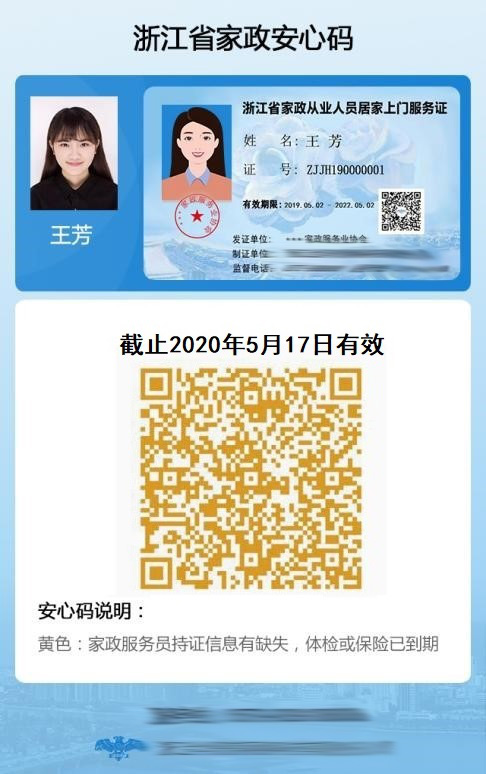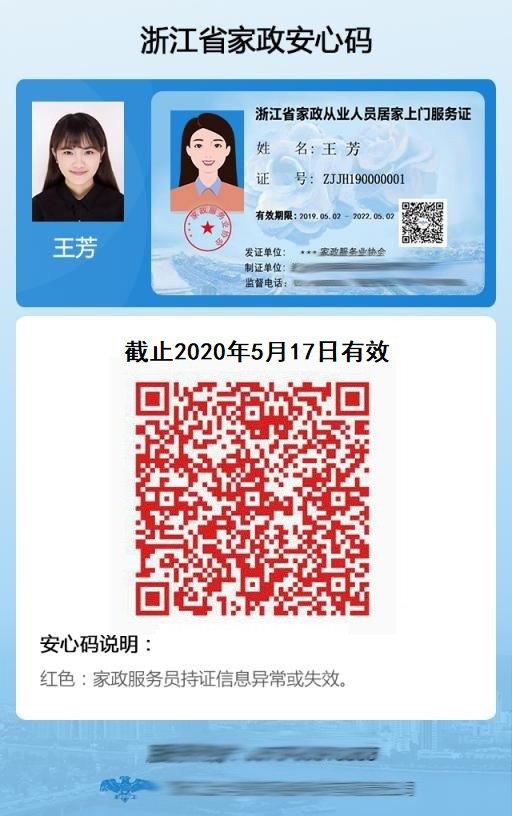 浙江省家政“安心碼”采取全省統(tǒng)一格式、各市分別制作、授權(quán)省市家政行業(yè)協(xié)會(huì)發(fā)放的形式推廣實(shí)施。為兼顧部分不適應(yīng)使用線上碼家政從業(yè)人員需求,允許備份使用“居家上門服務(wù)證”。“碼”與“證”具有同等效力,具體樣式詳見附件1。相關(guān)機(jī)構(gòu)在生成家政“安心碼”的同時(shí),即同步生成線上“居家上門服務(wù)證”,由家政從業(yè)人員自行決定是否制作線下實(shí)體證。